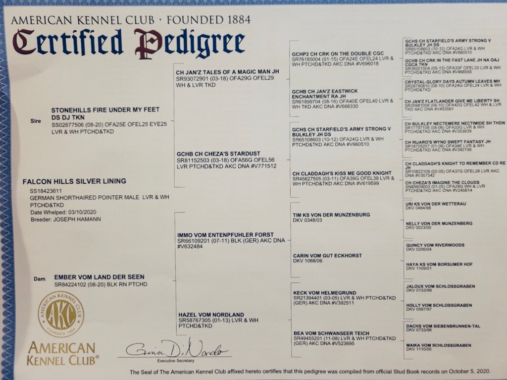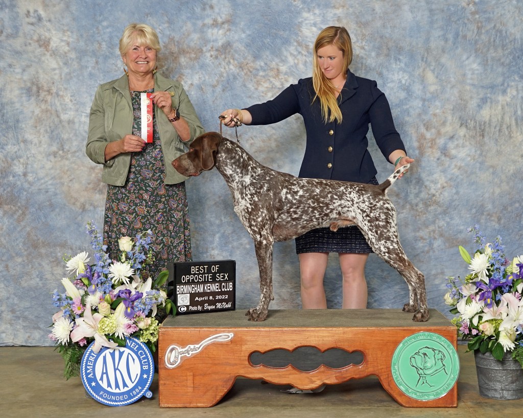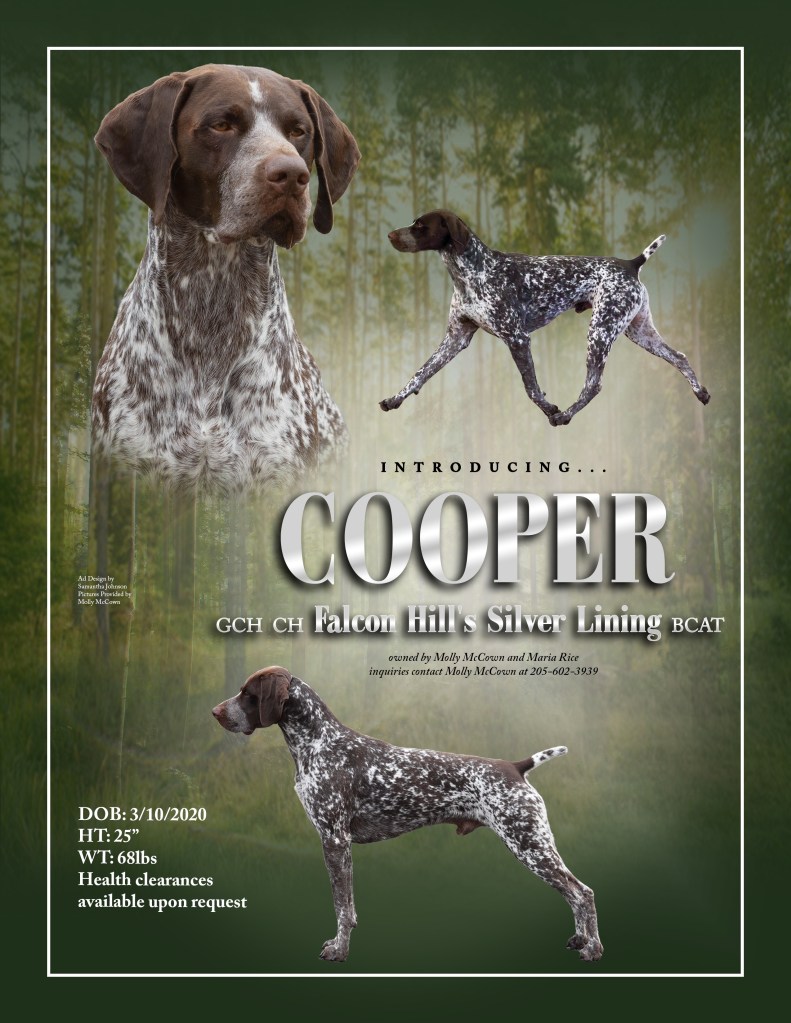 He was shown to his championship by Jennifer Bittner and is now shown selectively by friends and his owners! He has a fabulous temperament! He was in the Top 5 GSP rankings for AKC Fast CAT in 2021 with only 3 runs for the year! Cooper is proudly owned by Maria Rice and living his best retired life.
