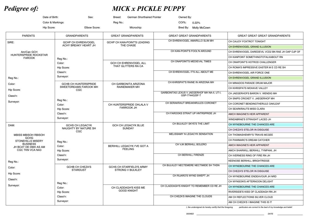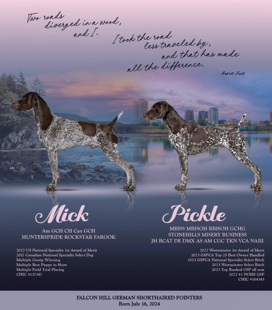July 16th, 2024 we welcomed 9 lovely puppies. They are by Am GCH Can GCH Hunterspride Rockstar Farook (Mick) and out of MBISS MBISOH RBISOH GCHG Stonehills Misery Business JH BCAT DE DMX AS AM CGC TKN VCA NAIII (Pickle). These two dogs are textbook shorthairs and we expect some lovely versatile puppies from this cross.